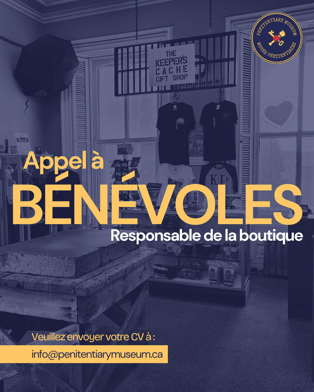 Les Amis du Musée pénitentiaire Inc. recherchent un(e) bénévole pour assurer la gestion quotidienne de la boutique de cadeaux du musée. Le rôle comprend la gestion des stocks, le soutien au personnel, le suivi des ventes et des rapports, ainsi que la collaboration avec l’équipe du musée et le conseil d’administration pour le développement des produits et la tarification.